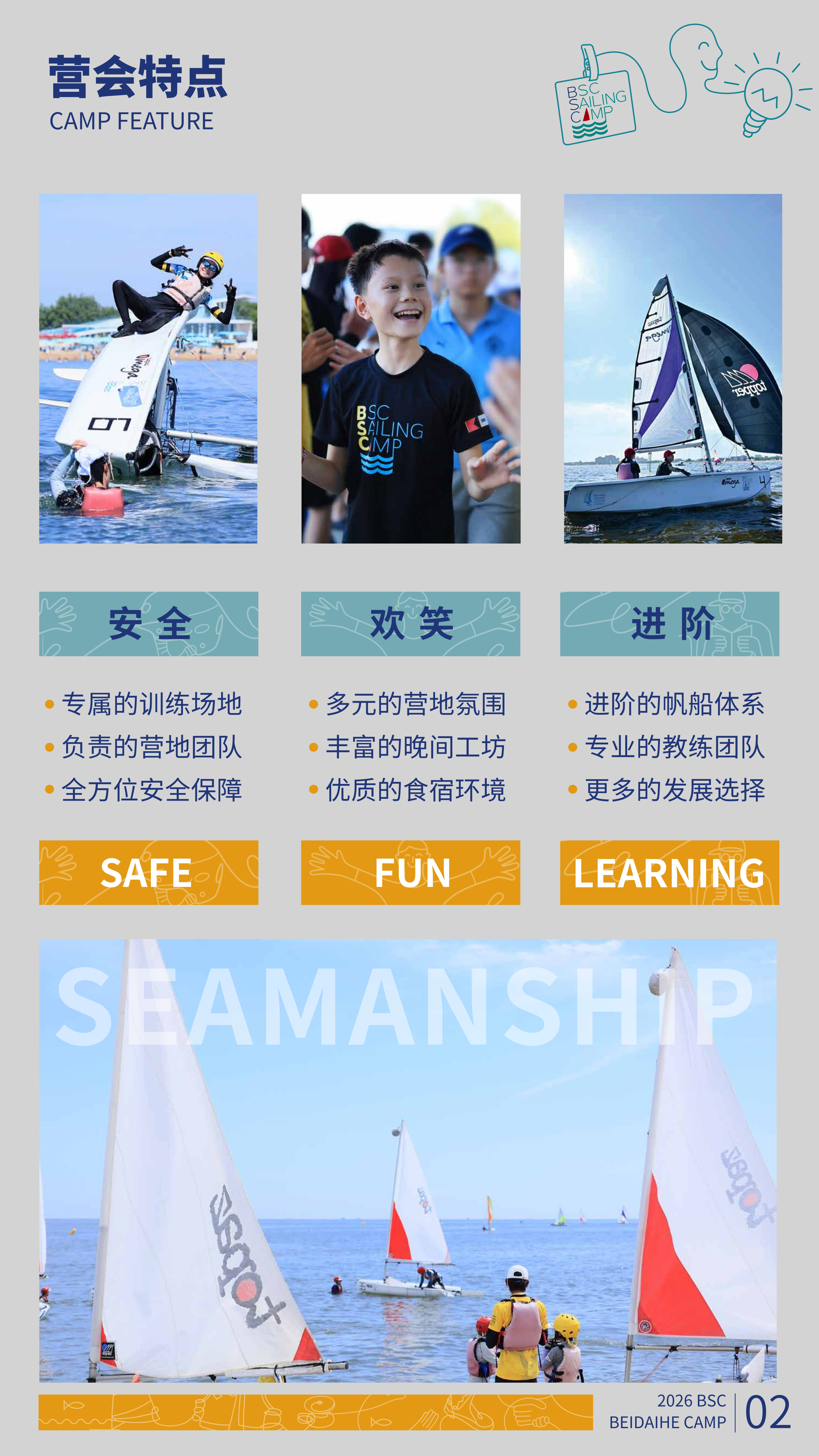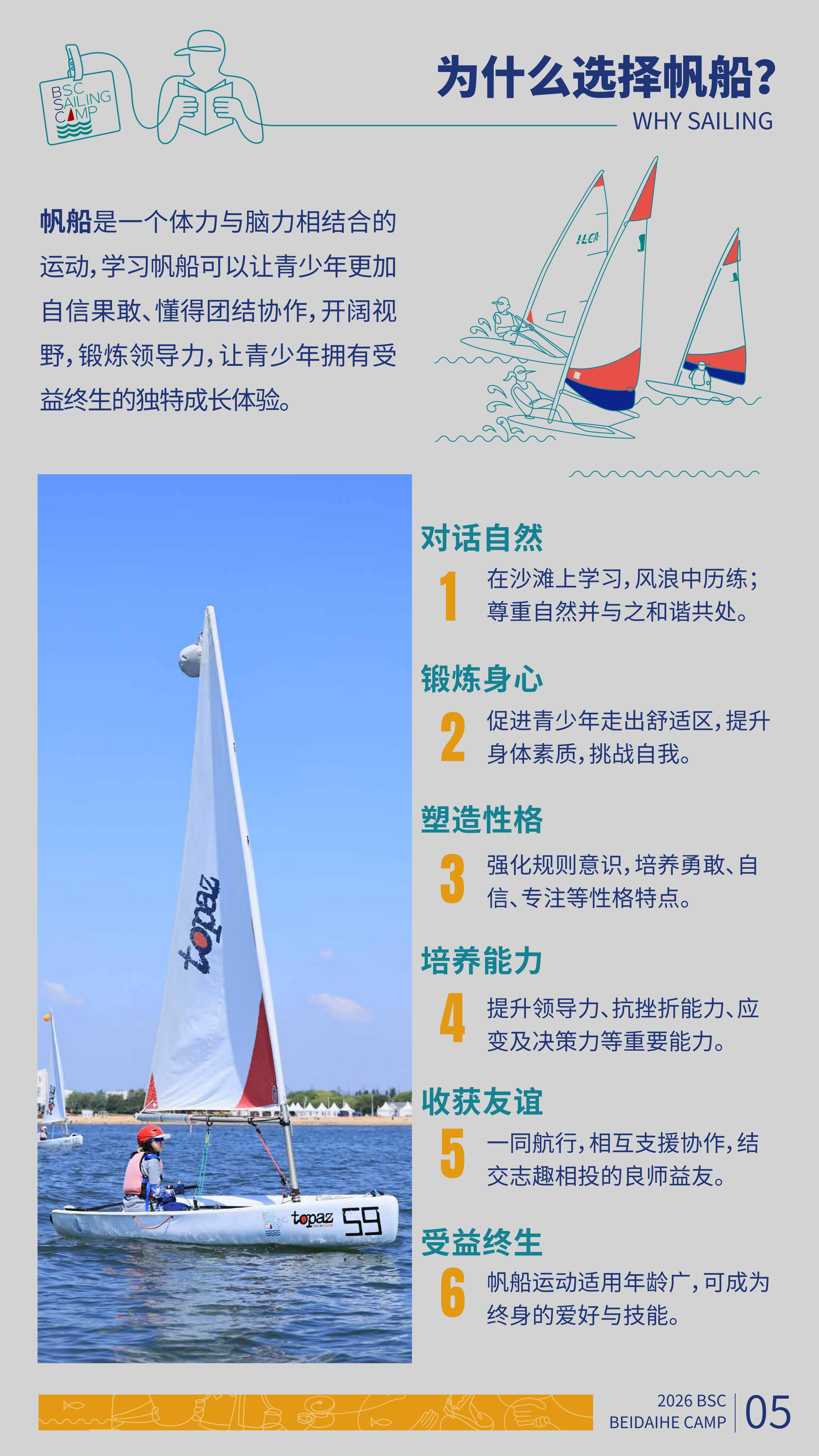 以大海为背景,帆船为载体,让孩子走出家门与大自然互动,在独立驾驶船和团队合作的水上运动中勇于承担责任。更重要的是培养了勇敢自信,勇于挑战等重要的性格特征,更锻炼了领导力,沟通能力,抗挫折能力等。